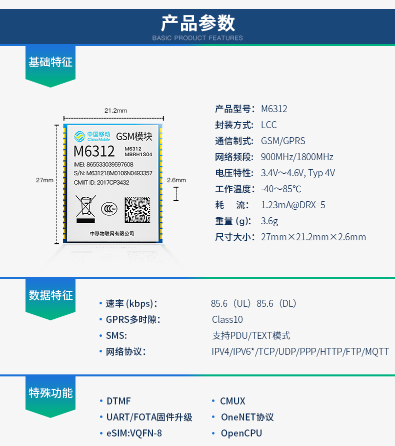 中國移動OneMO GSM/GPRS物聯(lián)網(wǎng)無線通信模塊M6312 2G模組