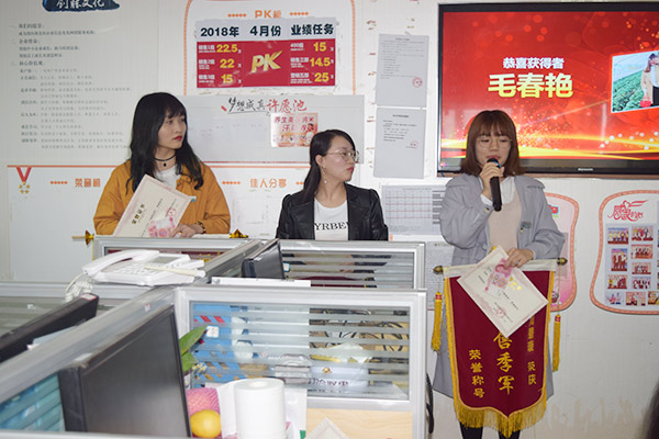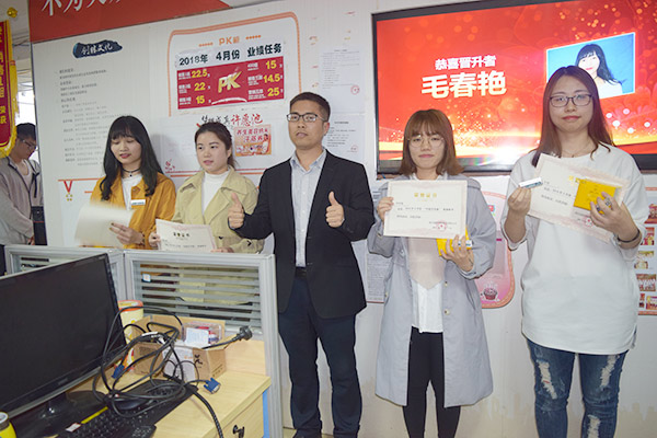(左一為3月份月度銷售冠軍—毛春燕)